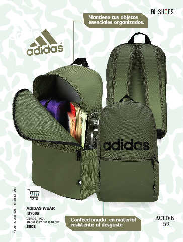 Mantiene tus objetos 59 esenciales organizados. * HASTA AGOTAR EXISTENCIAS. ADIDAS WEAR Confeccionada en material ACTIVE IS7065 VERDE_ PZA 16 CM X 27 CM X 46 CM 59 resistente al desgaste. $608