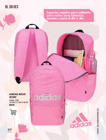 60 Espacios amplios para utilizarla para varios usos: Gimnasio, escuela o para el día a día. ADIDAS WEAR IS7067 ROSA_ PZA 16 CM X 27 CM X 46 CM $608 * HASTA AGOTAR EXISTENCIAS. 60