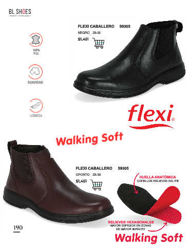 190 FLEXI CABALLERO 59305 NEGRO_ 25-30 $1,451 FLEXI CABALLERO 59305 OPORTO_ 25-30 HUELLA ANATÓMICA $1,451 COPIA LOS RELIEVES DEL PIE RELIEVES HEXAGONALES 190 MAYOR ESPESOR EN ZONAS DE MAYOR IMPACTO