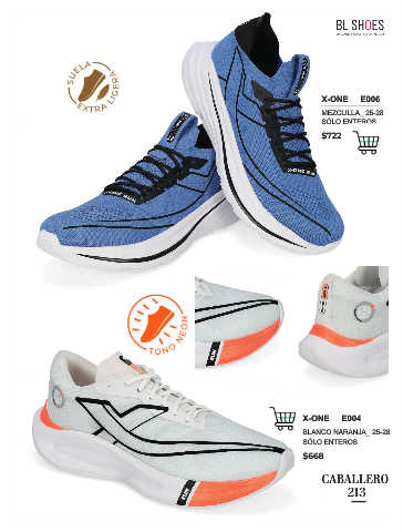 213 X-ONE E006 MEZCLILLA_ 25-28 SÓLO ENTEROS $722 X-ONE E004 BLANCO NARANJA_ 25-28 X-ONE E002 SÓLO ENTEROS BLANCO/CIELO_ 25-28 $668 SÓLO ENTEROS $695 CABALLERO 213