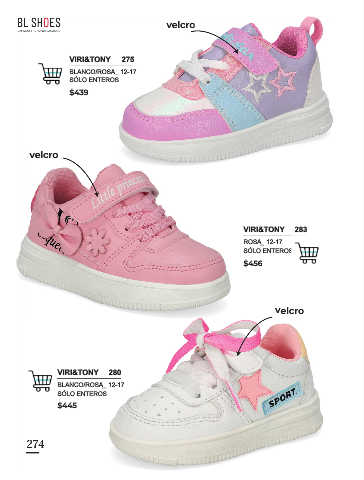 274 velcro VIRI&TONY 275 BLANCO/ROSA_ 12-17 SÓLO ENTEROS $439 velcro VIRI&TONY 283 ROSA_ 12-17 SÓLO ENTEROS $456 velcro VIRI&TONY 280 BLANCO/ROSA_ 12-17 SÓLO ENTEROS $445 274