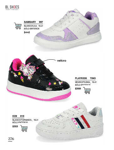 276 SAMBARY 997 BLANCO/LILA_ 15-21 SÓLO ENTEROS $445 velcro PLAYKIDS TINO NEGRO/FIUSHA_ 15-21 SÓLO ENTEROS $368 KX9 815 BLANCO/TORNASOL_ 15-21 SÓLO ENTEROS $353 276