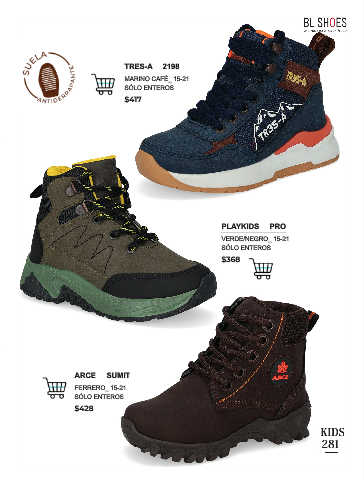 281 TRES-A 2198 MARINO CAFÉ_ 15-21 SÓLO ENTEROS $417 PLAYKIDS PRO VERDE/NEGRO_ 15-21 SÓLO ENTEROS $368 ARCE SUMIT FERRERO_ 15-21 SÓLO ENTEROS $428 KIDS 281
