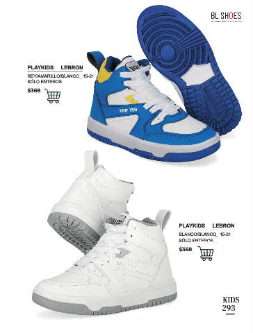 293 GARPER 413 NEGRO_ 12-17 SÓLO ENTEROS $389 PLAYKIDS LEBRON REY/AMARILLO/BLANCO_ 15-21 SÓLO ENTEROS $368 PLAYKIDS LEBRON BLANCO/BLANCO_ 15-21 SÓLO ENTEROS $368 KIDS 293