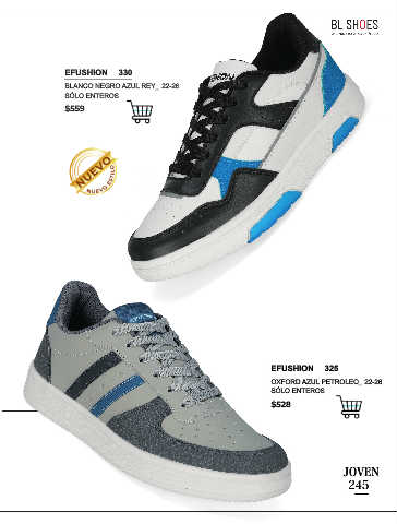 245 EFUSHION 330 BLANCO NEGRO AZUL REY_ 22-26 SÓLO ENTEROS $559 EFUSHION 325 OXFORD AZUL PETROLEO_ 22-26 SÓLO ENTEROS $528 JOVEN 245